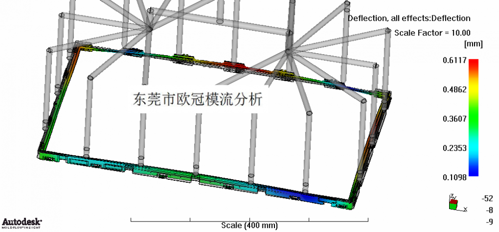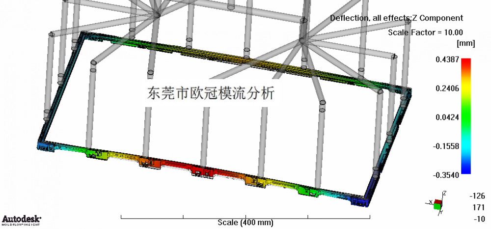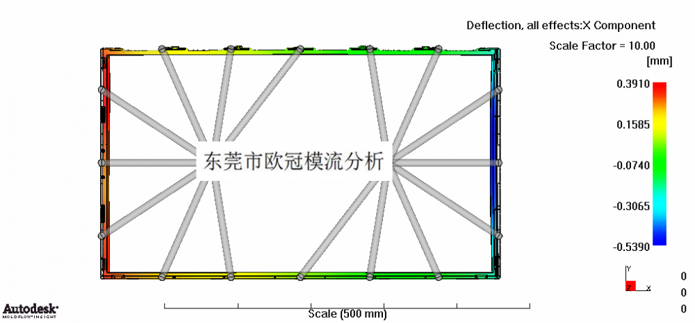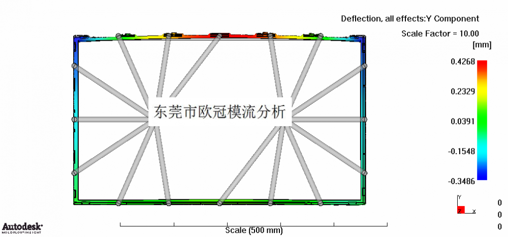 翘曲分析模块能预测塑料产品在开模后之收缩和翘曲结果。在材料库中有八千多种热塑性材料。您可应用线性或非线性分析,以预测塑料产品之缺陷及确定翘曲变形原因所在及变形量,结合调整水路/保压参数/进胶方式等进而提供变形量最小的可行方案,在模具制造前控制产品变形。 下图是电视中框Z周放大10效果。