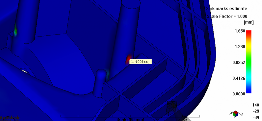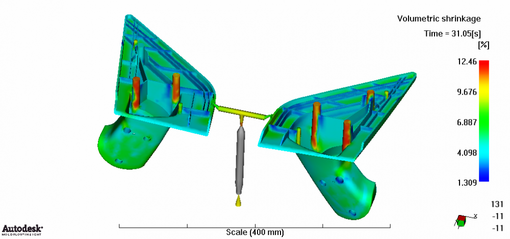收缩分析提供精确的收缩量评价和透过模具外型的收缩变化以确保预测产品收缩的尺寸。它允许调整射出成型条件、浇口的数目位置及材料以确保产品达到规定的收缩尺寸。收缩分析计算水平和垂直方向的流动,如使用特殊的收缩材料,亦可使用